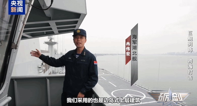 海军湖北舰 冉伟宏:站在驾驶室平台外侧,可以清晰看到整个飞行甲板的概况。从前至后,分别有6个起降点。在整个飞行甲板后侧,还设置了7号点,也就是一个小停机坪。这个停机坪,主要是用来保障无人机的起降。